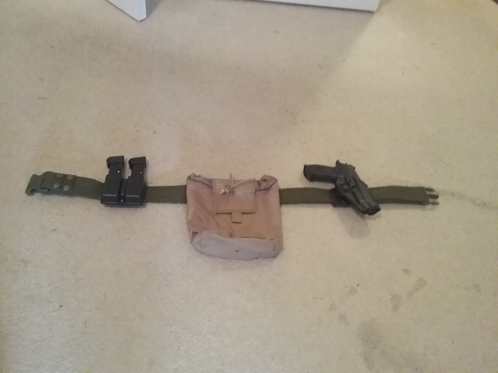 For a budget belt I use an old ALICE web belt I've had for years. I have a Safariland holster, double pistol mag pouch, double rifle mag pouch and an IFAK