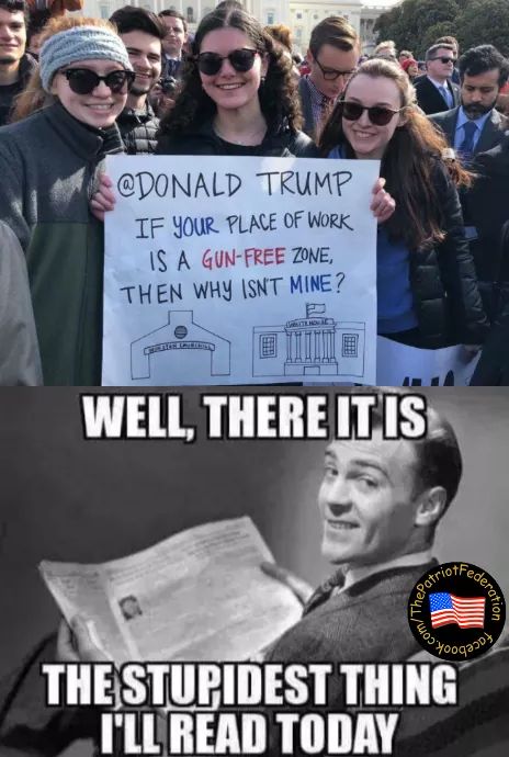 Yet another sign at a protest. This time, the sign reads, "Donald Trump if your place of work is a gun free zone, then why isn't mine?" Naturally, this is equally as asinine as the first photograph, as schools are gun free zones. Schools have been gun free zones since 1990 (hmmm...), with the Gun Free School Zone Act.